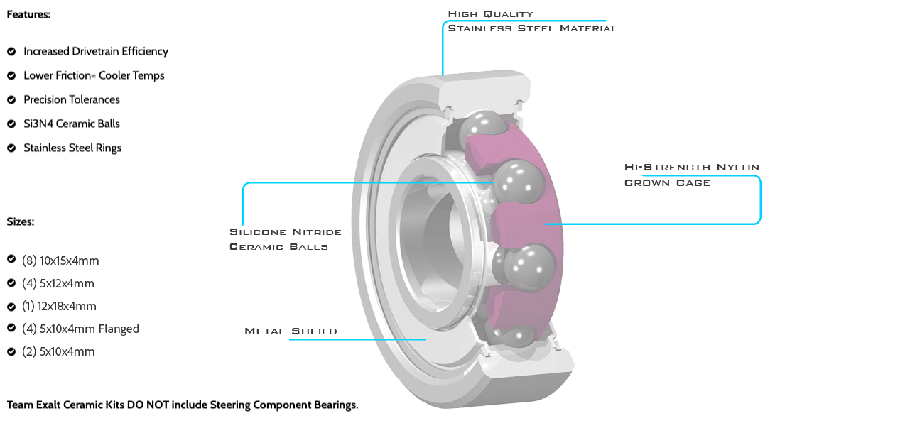 Team Exalt is proud to introduce our Hybrid-XSN Ceramic Bearing Line. Efficient drivetrain is very important not ONLY in Spec racing but any form of racing. The ALL NEW Hybrid-XSN line pairs the combination of Silicon Nitride ceramic balls and Stainless Steel inner/outer rings for higher speeds than full ceramic options. The stainless ring material helps limit any catastrophic failure under high speed or sudden impact situations. So with the combination of Performance and Durabilty look no further than the Exalt Hybrid-XSN Ceramic Bearing Line.